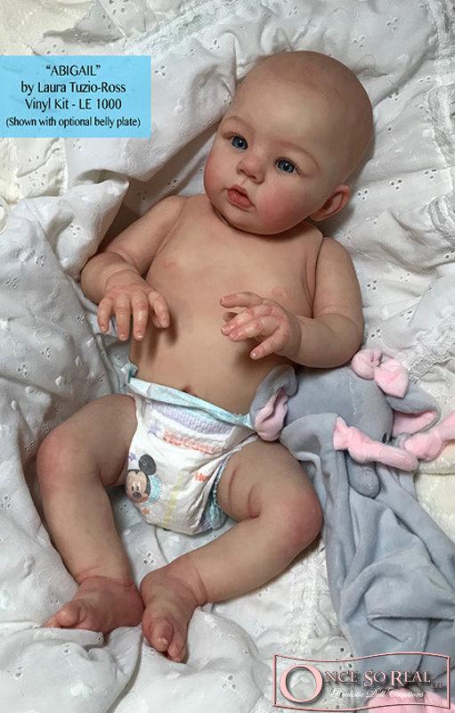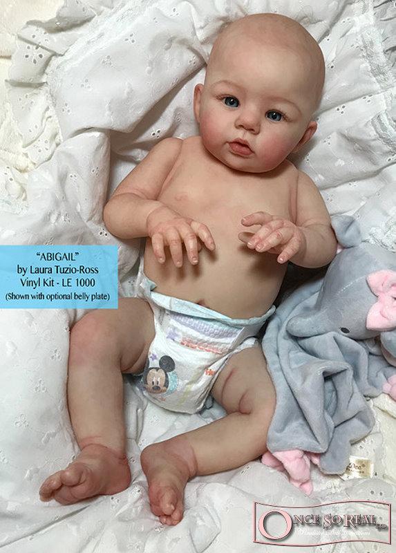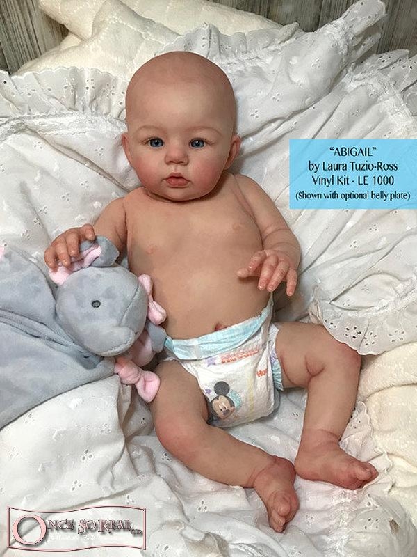Die Arme und Beine von Abigail sind lang modelliert, so dass das Baby später auch kurze Kleidung tragen kann. Das Vinyl ist hellbeige und weich, so dass es gut gefärbt und auch leicht gerootet werden kann. Es ist translucent und somit für die Innenfärbung geeignet.