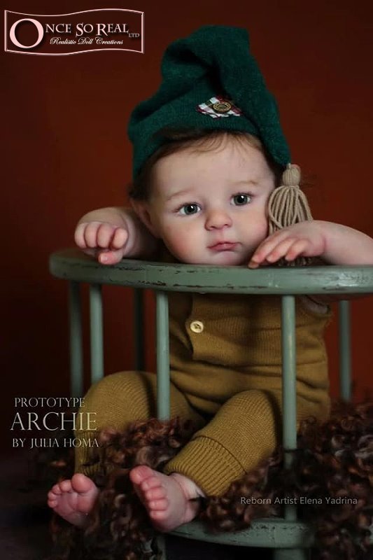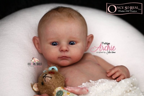 Die Arme und Beine von Archie sind lang modelliert, so dass das Baby später auch kurze Kleidung tragen kann. Das Vinyl ist hellbeige und hautähnlich weich, so dass es sehr gut gefärbt und auch gerootet werden kann. Es ist translucent und somit für die Innenfärbung geeignet.