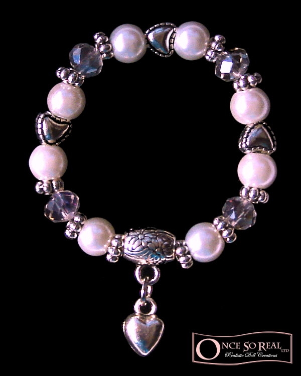 Wunderschönes und hochwertiges Baby-Armbändchen mit edlen Perlen aus Glas und kleinen Svarowski-Kristallen sowie Zierherzen und Charm in silber. Die Armbändchen sind handgearbeitet und mit einem flexiblen Band versehen. Sie sind passend für eine Babygröße von ca. 16" - 20" (41 - 51 cm).