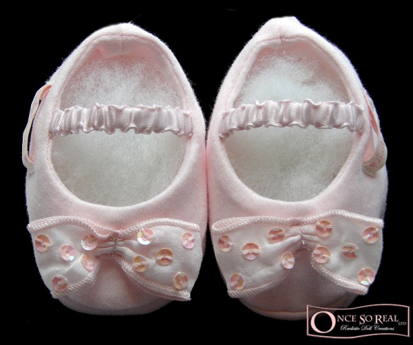 * einem Paar Booties in rosa mit aufgesetzter Schleife und Perlmutt-Pailletten sowie einem Satin-Gummizug am Schaft