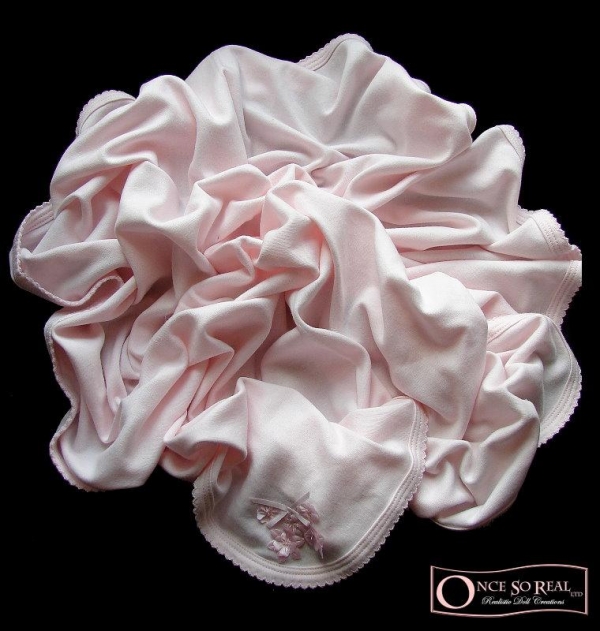 * einer Decke in rosa mit Mausezähchenverzierung und Satinblüten-Applikationen sowie Satin-Zierschleife in rosa