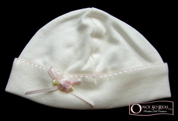 * einem Baumwoll-Mützchen in cremeweiss mit Umschlagrand und Mausezahnverzierung in rosa sowie Satinblüten-Applikationen und Satin-Zierschleife in rosa