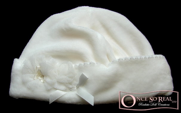 * einem Nicki-Baumwoll-Mützchen in cremeweiss mit Umschlagrand und Mausezahnverzierung sowie Tüllblüten-Applikationen und Satin-Zierschleife