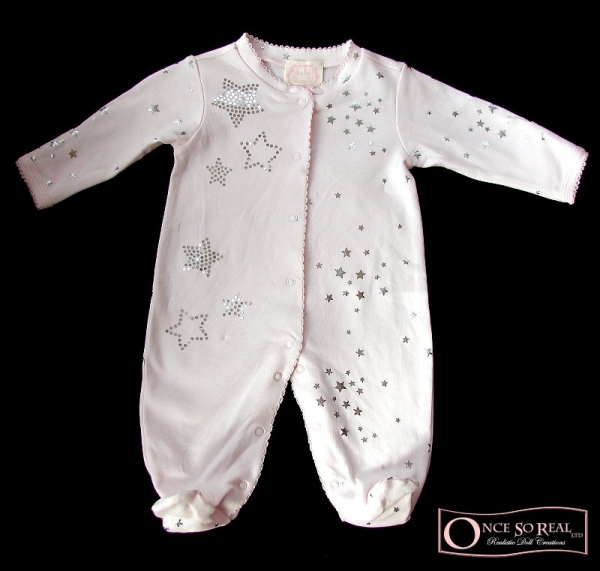 * einem langärmeligen Overall mit geschlossenen Füßen in rosa mit Mausezahn-Verzierungen und Sternchen-Applikationen in silber, Ärmel als Kratzschutz-Fäustlinge umschlagbar. Vorne und im Schritt mit Druckknöpfen zu öffnen