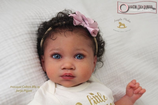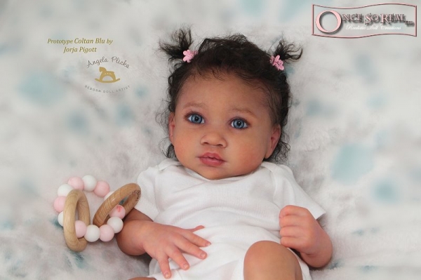 Die Arme und Beine von Coltan Blu sind lang modelliert, so dass das Baby später auch kurze Kleidung tragen kann. Das Vinyl ist hellbeige und sehr weich, so dass es sehr gut gefärbt und auch leicht gerootet werden kann. Es ist translucent und somit für die Innenfärbung geeignet.