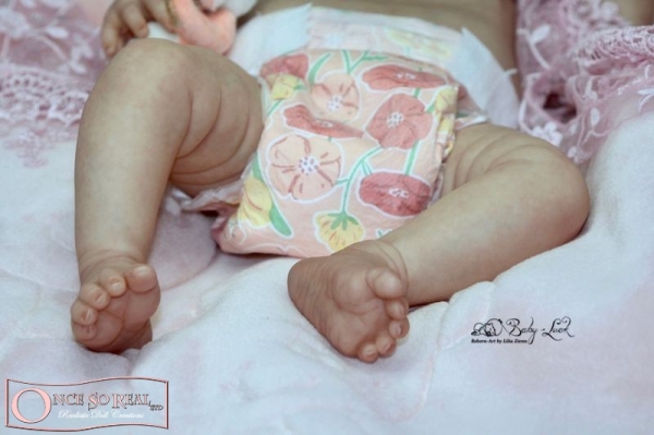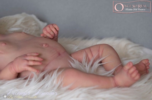 Die Arme und Beine von Demi sind lang modelliert, so dass das Baby später auch kurze Kleidung tragen kann. Das Vinyl ist hellbeige und sehr weich, so dass es sehr gut gefärbt und auch leicht gerootet werden kann. Es ist translucent und somit für die Innenfärbung geeignet.