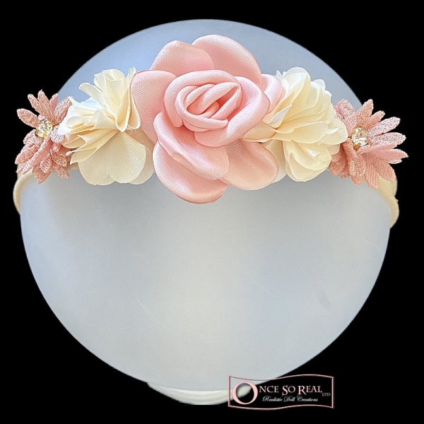 Wunderschönes Haarbändchen mit kleinen Rosen- und Blüten-Applikationen aus Tüll und Spitze mit Strassverzierungen. Das Gewebeband des Haarbändchens ist elastisch, so dass es für unterschiedliche Babykopfgrößen geeignet ist. Es gibt eurem Rebornbaby den letzten Schliff, hält das Haar schön am Köpfchen und deckt nicht das komplette Rooting ab, wie es bei Mützchen der Fall ist. Ihr findet bei uns unzählige Modelle in edlen Designs und vielen Farben, die ihr mit nahezu jeder Babykleidung kombinieren könnt! Sie sind eine ideale Alternative für kleine Mädchen!