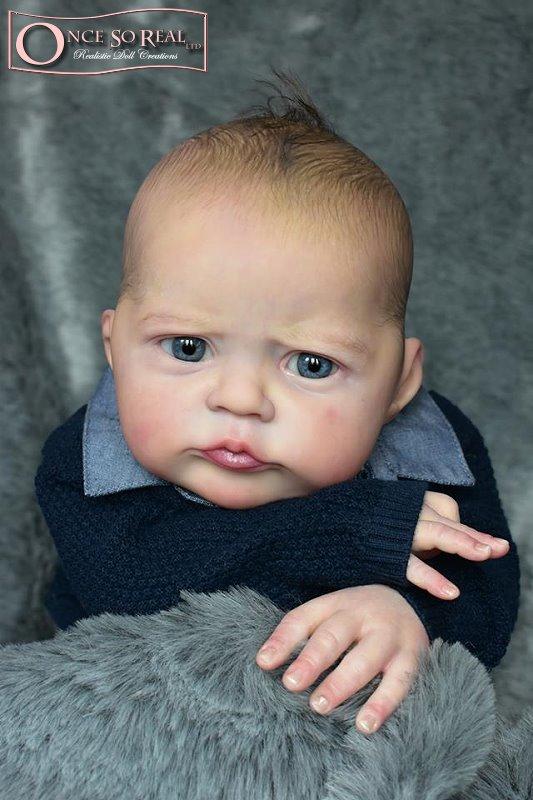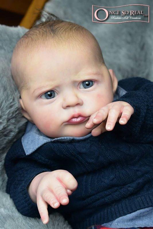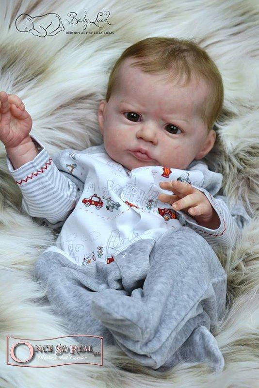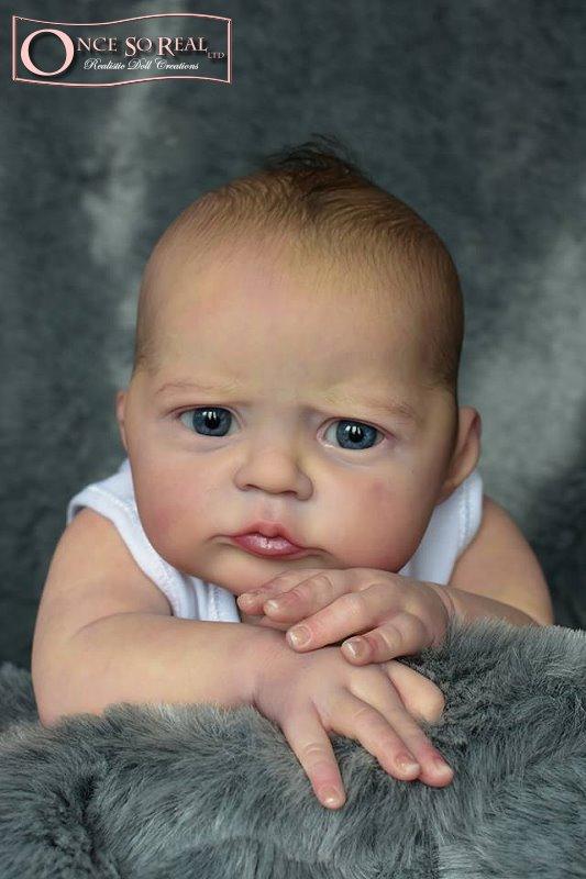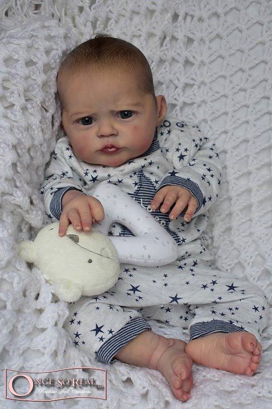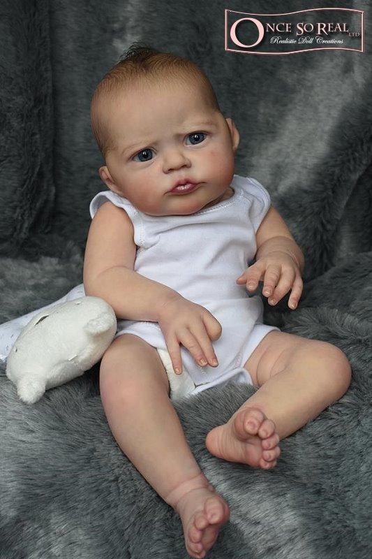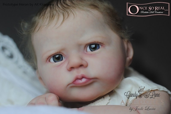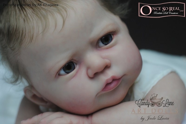 Die Arme und Beine von Heron sind lang modelliert, so dass das Baby später auch kurze Kleidung tragen kann. Das Vinyl ist hellbeige und hautähnlich weich, so dass es sehr gut gefärbt und auch gerootet werden kann. Es ist translucent und somit für die Innenfärbung geeignet.