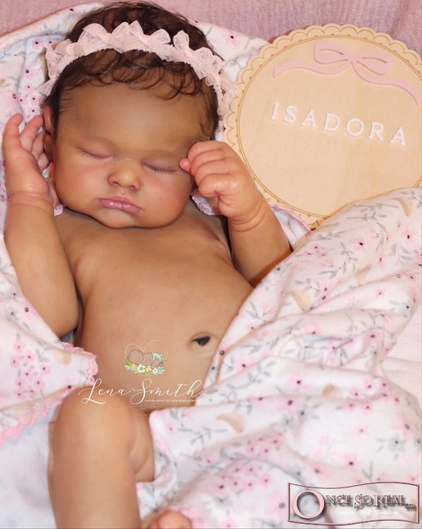 Die Arme und Beine von Isadora sind lang modelliert, so dass das Baby später auch kurze Kleidung tragen kann. Das Vinyl ist hellbeige und sehr weich, so dass es sehr gut gefärbt und auch leicht gerootet werden kann. Es ist translucent und somit für die Innenfärbung geeignet.
