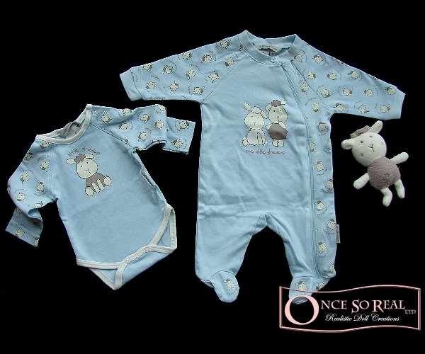 * einem Langarm-Strampler in hellblau mit Schaf-Print in beige-braun und Reißverschluss an der Seite