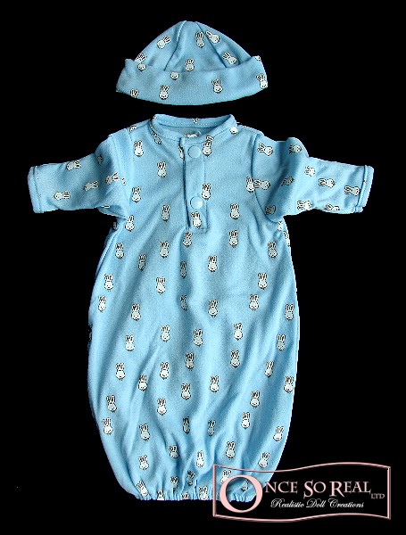 2-teiliges Outfit für kleine Jungen, bestehend aus einem langärmeligen Gown in hellblau mit Hasen-Allover-Druck. Mit Gummizug an den Füßen und Knopfleiste auf der Brust sowie passender Mütze. Das Outfit passt für eine Babygröße von 17 - 19 inch (43 - 48 cm). Von diesem Outfit haben wir mehrere auf Lager.