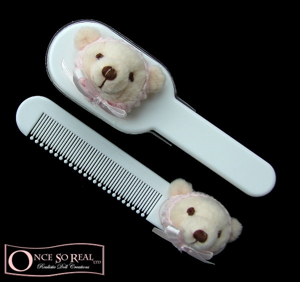 Dieses edle Designer Kamm- und Bürstenset aus Spanien haben wir für kleine Jungen oder Mädchen im Angebot. Die Farben lassen sich sehr schön mit nahezu jeder Babykleidung kombinieren. Auf der weißen Bürste ist ein kleiner Bärenkopf mit Häkelmütze und Satinschleife angebracht. Ein passender weißer Kamm mit demselben süßen Bärenkopf rundet das Set ab. Es ist ein schönes und unverzichtbares Accessoire für die Gestaltung von Rebon Babys und eignet sich perfekt für eine realitätsnahe Präsentation! Das Set wird im durchsichtigen Geschenkkarton mit Satinschleife geliefert.