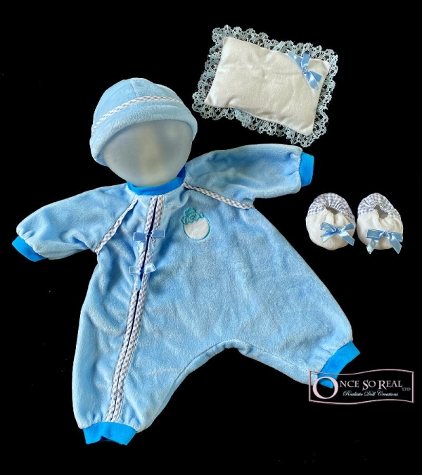 4-teiliges Outfit für kleine Mädchen und Jungen, bestehend aus einem langärmeligen Flanell-Overall in weiß-hellblau mit Karo-Applikationen und aufgesetzten Taschen mit Karo-Druck, einem passenden Mützchen in hellbllau, passenden Schühchen in hellblau mit Karo-Druck sowie einem Kissen in weiß mit Spitzenbordüre. Im Rücken durch Klettverschluss zu schließen. Das Outfit passt für eine Babygröße von 18 - 20 inch (46 - 51 cm).