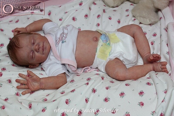 Die Arme und Beine von Maja sind lang modelliert, so dass das Baby später auch kurze Kleidung tragen kann. Das Vinyl ist hellbeige und hautähnlich weich, so dass es sehr gut gefärbt und auch gerootet werden kann. Es ist translucent und somit für die Innenfärbung geeignet.