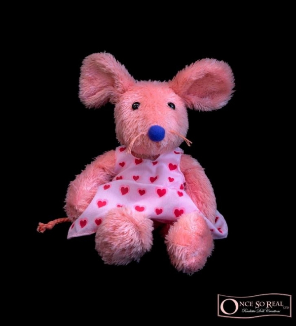 "Molly" ist eine Maus aus weichem rosafarbenem Plüsch und kleinen Knopfaugen sowie einem Kleidchen mit Herzchen-Allover-Print. Sie ist ca. 22 cm groß und kann sitzend und liegend präsentiert werden.