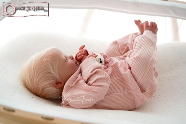 Die Arme und Beine von Olivia sind lang modelliert, so dass das Baby später auch kurze Kleidung tragen kann. Das Vinyl ist hellbeige und hautähnlich weich, so dass es sehr gut gefärbt und auch gerootet werden kann. Es ist translucent und somit für die Innenfärbung geeignet.