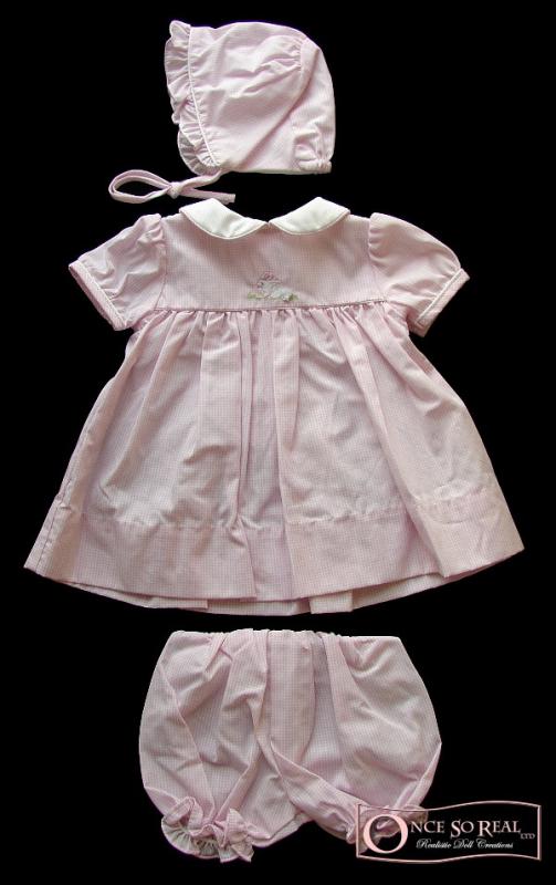 * einem Kleidchen in rosa kariert, kurzen Ärmeln mit Umschlagkante, weißer Rundkragen und Hasenstickerei auf der Brust