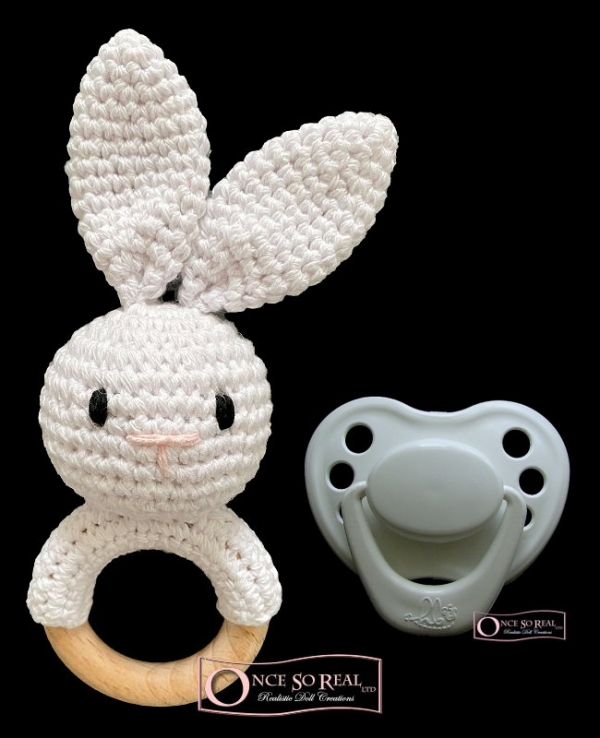 Dieses niedliche Häkel-Rasseltierchen haben wir für kleine Jungen oder Mädchen im Angebot. Die Farben lassen sich sehr schön mit nahezu jeder Babykleidung kombinieren. Der Hase ist aus feinstem Garn gehäkelt und um einen Holzring gespannt. Im Inneren des Kopfes befindet sich eine kleine Rassel. Es ist ein schönes und unverzichtbares Accessoire für die Gestaltung von Reborn- und Silikon-Babys und eignet sich perfekt für eine realitätsnahe Präsentation! Zusätzlich zu dem Rasseltierchen erhaltet ihr einen farblich passenden Honeybug-Schnuller zum Bundle-Vorteilspreis!