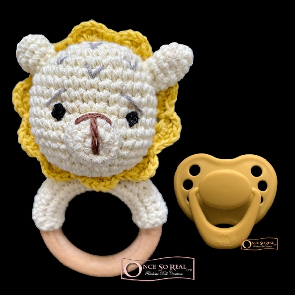 Dieses niedliche Häkel-Rasseltierchen haben wir für kleine Jungen oder Mädchen im Angebot. Die Farben lassen sich sehr schön mit nahezu jeder Babykleidung kombinieren. Der Hase ist aus feinstem Garn gehäkelt und um einen Holzring gespannt. Im Inneren des Kopfes befindet sich eine kleine Rassel. Es ist ein schönes und unverzichtbares Accessoire für die Gestaltung von Reborn- und Silikon-Babys und eignet sich perfekt für eine realitätsnahe Präsentation! Zusätzlich zu dem Rasseltierchen erhaltet ihr einen farblich passenden Honeybug-Schnuller zum Bundle-Vorteilspreis!