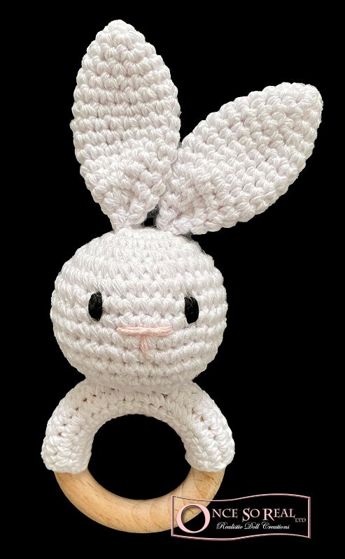 Dieses niedliche Häkel-Rasseltierchen haben wir für kleine Jungen oder Mädchen im Angebot. Die Farben lassen sich sehr schön mit nahezu jeder Babykleidung kombinieren. Der Hase ist aus feinstem Garn gehäkelt und um einen Holzring gespannt. Im Inneren des Kopfes befindet sich eine kleine Rassel. Es ist ein schönes und unverzichtbares Accessoire für die Gestaltung von Reborn- und Silikon-Babys und eignet sich perfekt für eine realitätsnahe Präsentation!