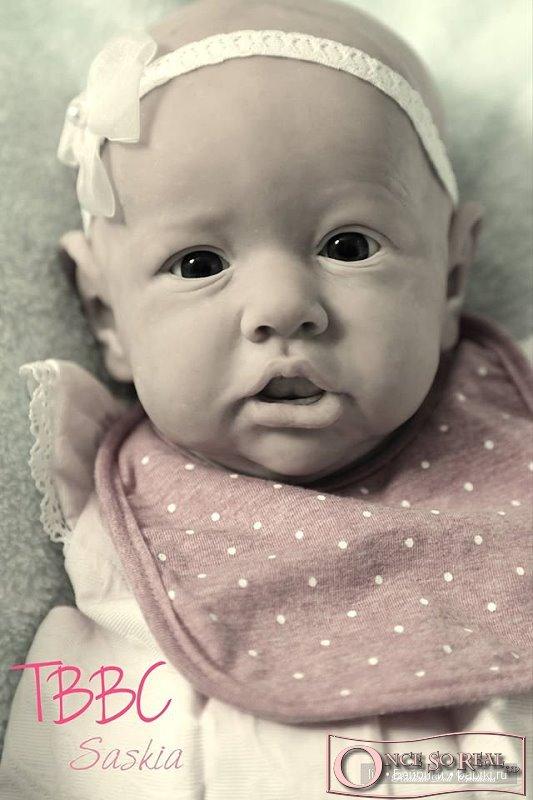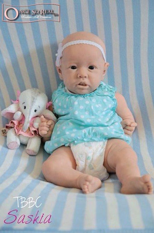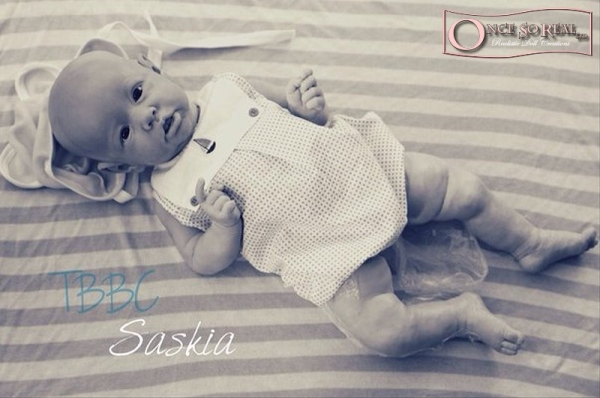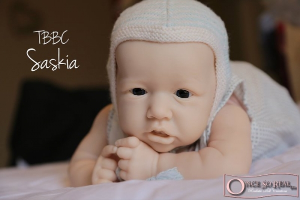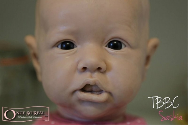Die Arme und Beine von Saskia sind lang modelliert, so dass das Baby später auch kurze Kleidung tragen kann. Das Vinyl ist hellbeige und sehr weich, so dass es sehr gut gefärbt und auch leicht gerootet werden kann. Es ist translucent und somit für die Innenfärbung geeignet.