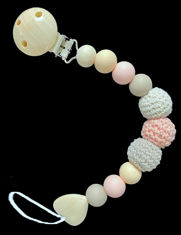 Mit Silikon- und Häkelperlen sowie einem Holz-Herzen