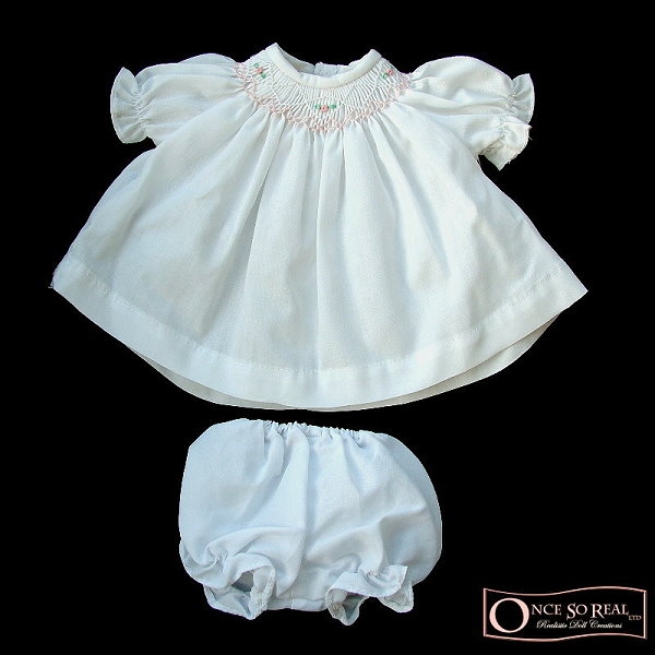 * einem gesmokten Kleidchen in weiß mit Rosen-Verzierung und Stickereien in rosa sowie Puffärmeln
