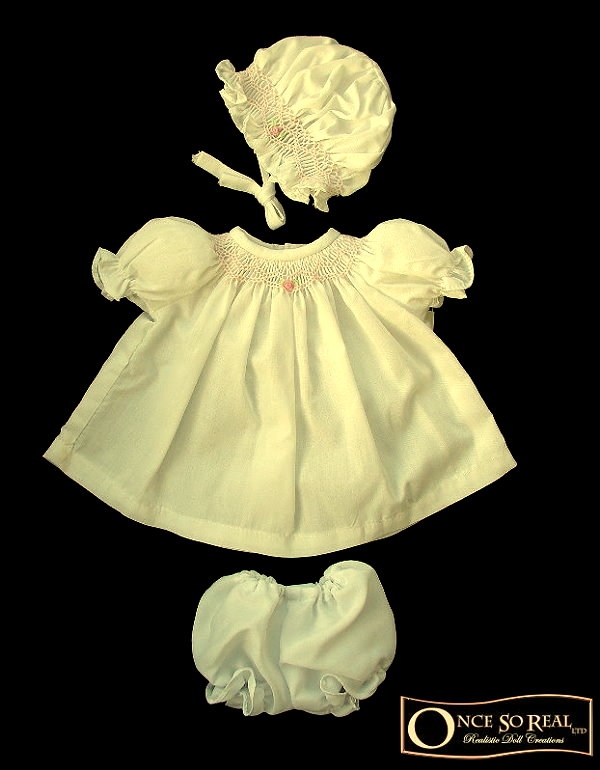 * einem gesmokten Kleidchen in creme mit Rosen-Verzierung und Stickereien in pink sowie Puffärmeln