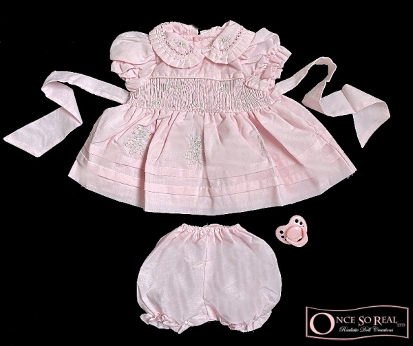*einem gesmokten Kleidchen in rosa mit Rundkragen mit Blütenstickereien, mit kurzen Ärmeln mit Gummizug sowie zwei Bindebändern zum Schließen am Rücken
