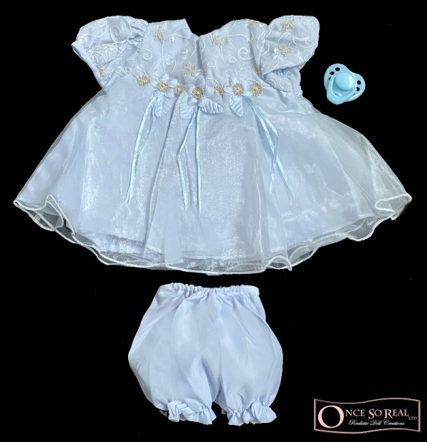*einem Kleidchen in hellblau mit Blütenstickerei und Verzierungen in Gold, mit kurzen Ärmeln mit Gummizug